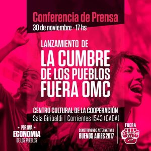 La Confluencia Fuera OMC invita a los medios y a la sociedad en general a una Conferencia de Prensa, el jueves 30 de noviembre, a las 17 hs, en la Sala Giribaldi del Centro Cultural de la Cooperación (Corrientes 1543 – CABA) para presentar el Programa de la Semana de Acción contra la OMC que se desarrollará entre los días 7 y 13 de Diciembre e incluye la Cumbre de los Pueblos “Fuera OMC – Construyendo Soberanía” del 11 al 13 de este mes.
