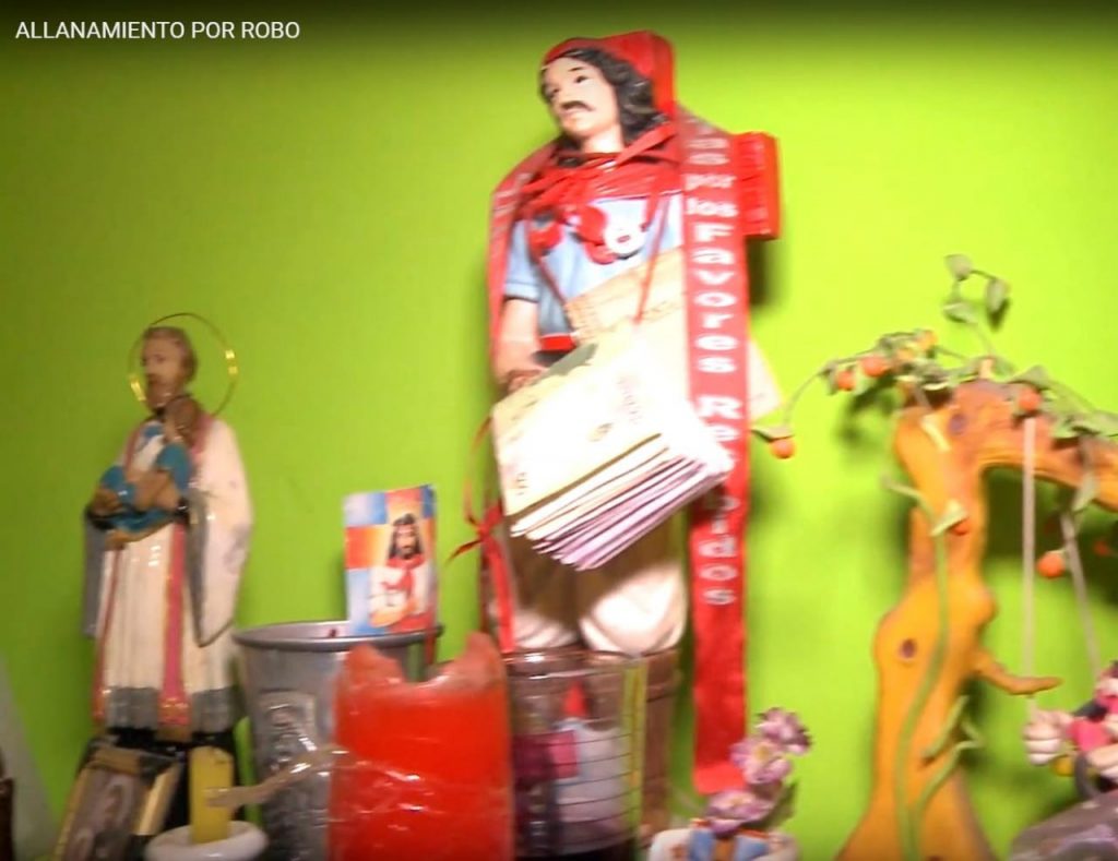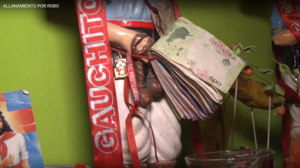 En tanto, en uno de los domicilios, los efectivos tuvieron que utilizar un artefacto explosivo para sortear el portón de acceso –construido con hierro blindado- y en su interior hallaron un santuario del Gauchito Gil, con varios billetes como ofrenda.