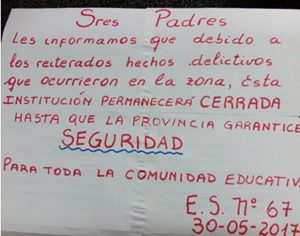 “Estas situaciones de violencia y robos, que han ocasionado serias lesiones a nuestros compañeros, se vienen sucediendo hace varios meses”, alertaron, situación que se conoció en los medios la semana pasada. “Los docentes decimos basta, ya que no están garantizadas la seguridad para la comunidad toda”, apuntaron desde la Unión de Docentes de la provincia de Buenos Aires.