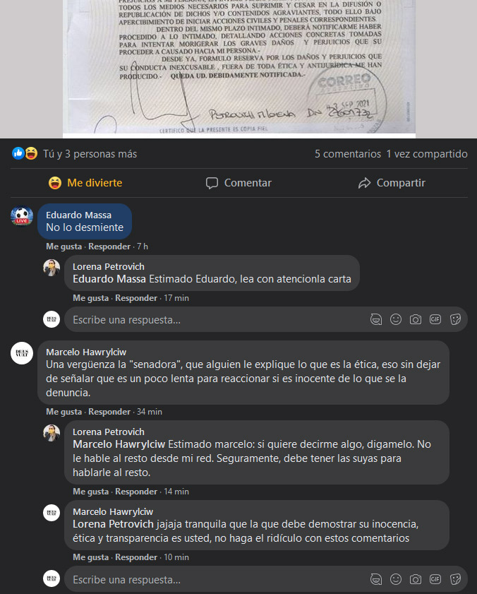 La denunciada senadora Lorena María Petrovich, parece estar muy activa en las redes sociales y muy atenta a salir a «cruzar» cualquier comentario que no sea de su agrado, lo cual está muy bien, para eso son las redes sociales, pero, cuando haces un comunicado a los medios para defenderte y respondes a los comentarios sin sostener tu posición en el comunicado, eso se llama incoherencia y es hacer el ridículo.