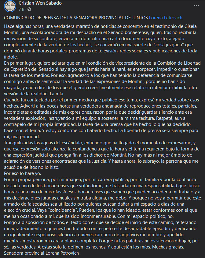 La senadora, tiene todo el derecho de defenderse de las graves acusaciones de la forma que considere más eficiente, el comunicado que acompaña la Carta Documento a la ex empleada de la Legislatura Bonaerense, que la acusó de una relación laboral irregular tiene algunas cuestiones que no son del todo claras de quien se dice inocente, pero es un tema que debe resolver con sus abogados o buscar un mejor asesoramiento.