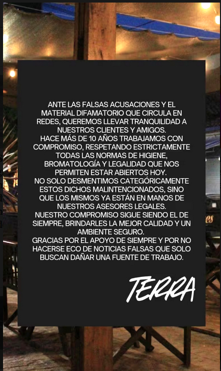 Luego de la viralización del video y la repercusión que tuvo, Terramar difundió en su cuenta de Instagram un comunicado. “Ante las falsas acusaciones y el material difamatorio que circula, queremos llevar tranquilidad a nuestros clientes. Estamos hace más de 10 años respetando estrictamente todas las normas de higiene, bromatología y legalidad”, indicó el bar.