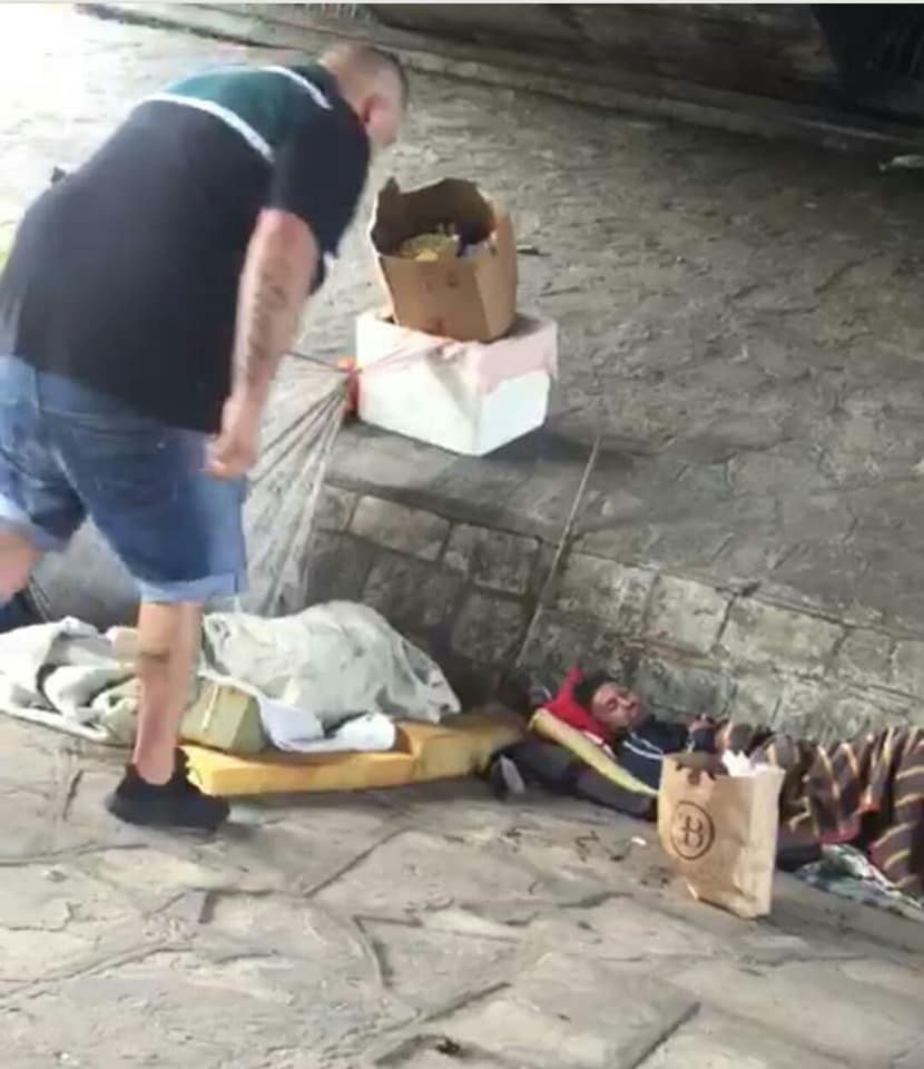 Mientras los dos hombres en situación de calle dormían en colchones sobre la vereda, un conductor detuvo su vehículo marca Volkswagen y comenzó a filmar a los indigentes.