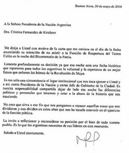 Me dirijo a Usted con motivo de la carta que me enviara en el día de la fecha anunciando su intención de no asistir a la Función de Reapertura del Teatro Colón en la noche del Bicentenario de la Patria.