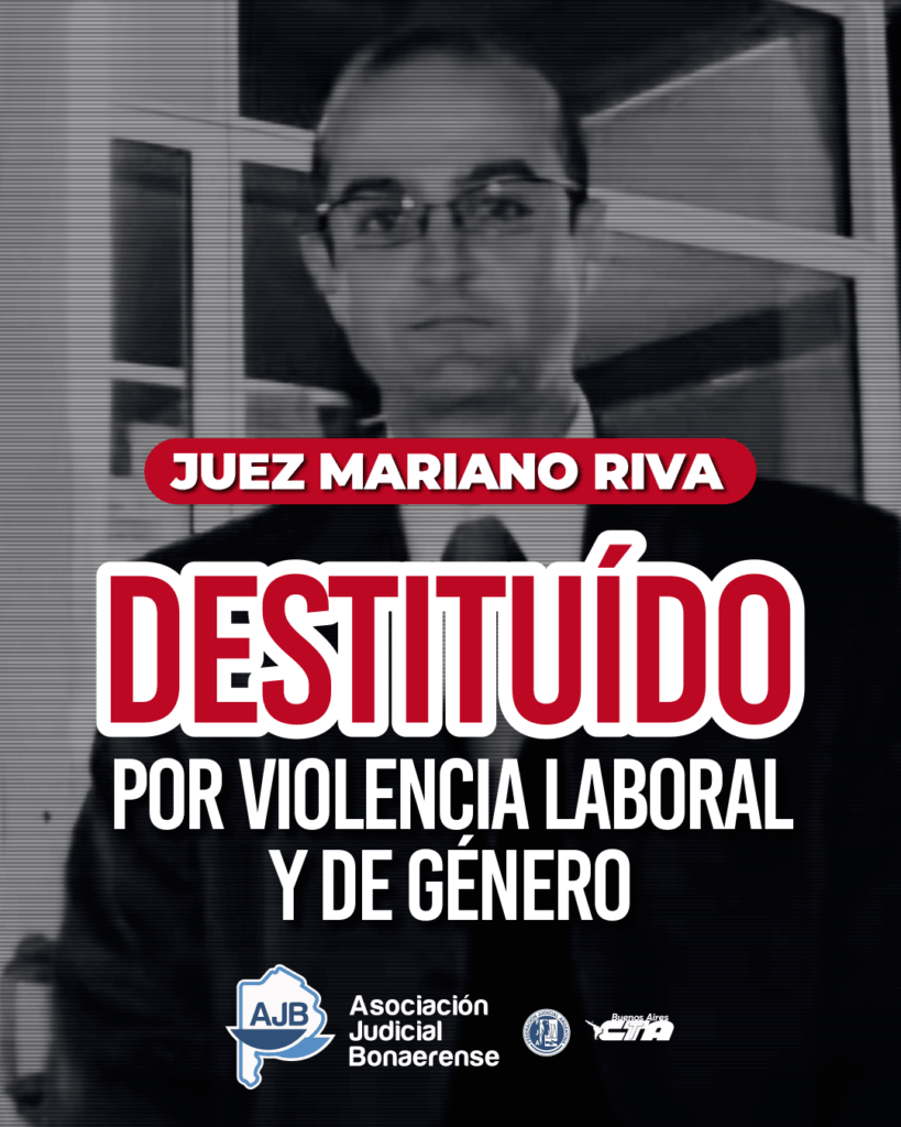 El Jurado de Enjuiciamiento dio a conocer hoy, 25 de marzo, la sentencia en el proceso de jury seguido contra el juez Mariano Riva, titular del Tribunal de Trabajo N° 4 de Mar del Plata, impulsado por la Asociación Judicial Bonaerense por graves hechos de violencia laboral y de género.