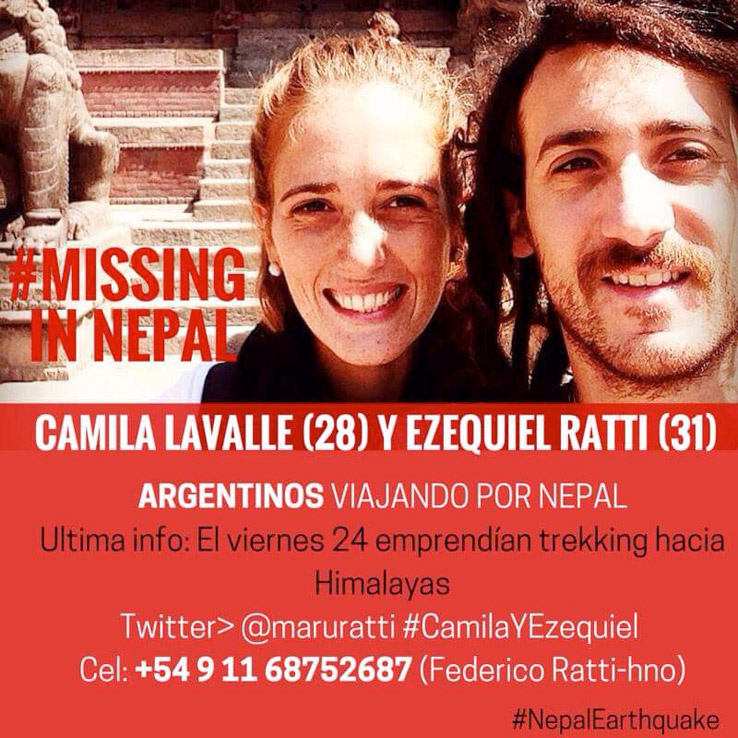 Una joven pareja Argentina desaparecida en Nepal. Rt #CamilaYEzequiel #NepalEarthquake.