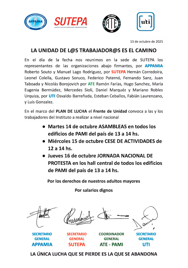 En conjunto, los cuatro gremios decidieron realizar este martes asambleas en todos los edificios del PAMI del país, entre las 13 y las 14 horas.