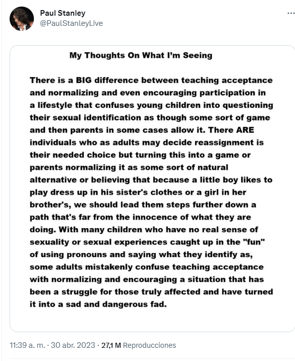 En recientes declaraciones en su cuenta de Twitter, el guitarrista y vocalista de Kiss, compartió un comunicado donde reprueba que a los niños se les inculque la identidad de género, rotulando la práctica como una “triste y peligrosa moda”. Aquí sus declaraciones: