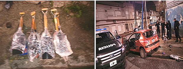 Una vez atendidos medicamente estos tres últimos y asistido por un testigo hábil se procede a la requisa del automóvil Peugeot, donde se logra hallar e incautar CUATRO JUEGOS DE HERRAMIENTAS DE ALBAÑILERIA que contienen cada uno de ellos UNA PALA ANCHA, UNA PALA DE PUNTA, UN NIVEL y SEIS JUEGOS DE GUANTES IGNIFUGOS.