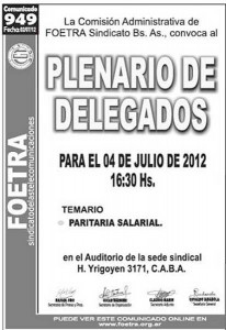 Plenario de delegados en FOETRA admin / julio 4, 2012 La Comision Administrativa De Foetra Sindicato Buenos Aires convocó al Plenario de Delegados el miércoles 4 de julio en la sede del mismo, a las 16.30 hs: Temario Paritaria Salarial. Share on FacebookTweet