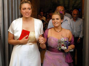 El casamiento se realizó este mediodía en el Registro Civil de Uruguay 753 ante el mismo juez de paz que casó a Mauricio Macri y Juliana Awada. Las novias dieron órdenes expresas de no dejar pasar a ningún medio de comunicación a la ceremonia. Vestidas una de blanco y otra de rosa, ambas lucieron zapatos dorados y tenían el pelo rubio lleno de bucles y recogido.