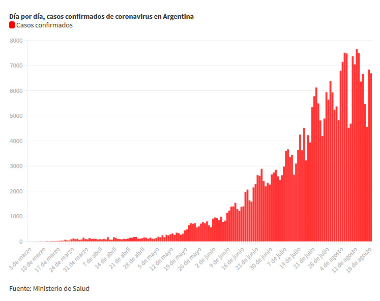 Así dio a conocer el ministerio de salud en el parte vespertino de este miércoles 19 de agosto. Fueron 6693 contagios en un día. El número total de casos es de 312.659.