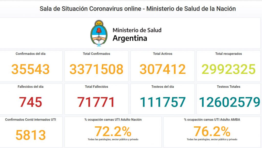 La segunda ola de coronavirus no cede en todo el país y este martes fue el día récord en cantidad de muertes y contagios. Es que según el Ministerio de Salud 745 personas fallecieron y 35.543 fueron diagnosticadas con Covid-19 en las últimas 24 horas.