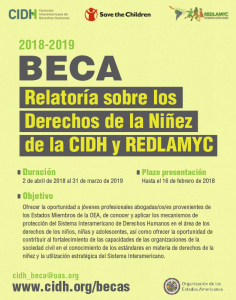 6) Objetivo: Ofrecer la oportunidad a jóvenes profesionales abogadas/os/es provenientes de los Estados Miembros de la OEA, de conocer y aplicar los mecanismos de protección del Sistema Interamericano de Derechos Humanos en el área de los derechos de los niños, niñas y adolescentes, así como ofrecer la oportunidad de contribuir al fortalecimiento de las capacidades de las organizaciones de la sociedad civil en el conocimiento de los estándares en materia de derechos de la niñez y la utilización estratégica del Sistema Interamericano. “Esta beca es una iniciativa de cooperación entre la SE/CIDH, SCI y REDLAMYC”.