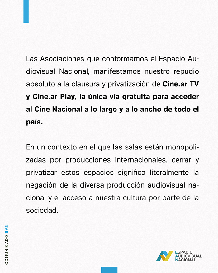 Las Asociaciones que conformamos el Espacio Audiovisual Nacional, manifestamos nuestro repudio absoluto a la clausura y privatización de Cine.ar TV y Cine.ar Play, la única vía gratuita para acceder al Cine Nacional a lo largo y a lo ancho de todo el país.