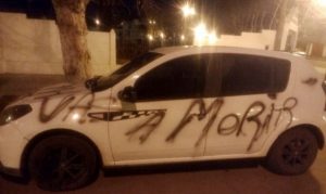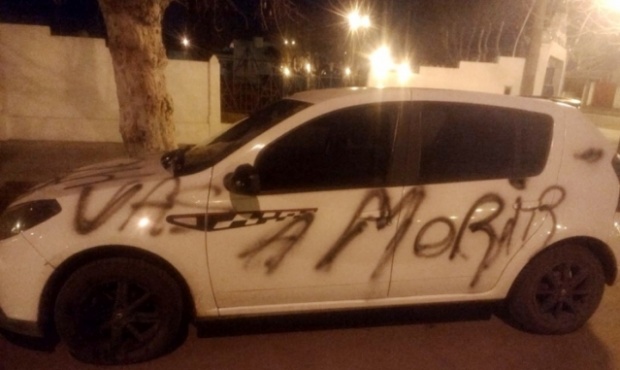 El lunes a la madrugada, el Subteniente Enrique Gallardo dejó estacionado su vehículo, un Renault Sandero, en la puerta de la Comisaría de Salliqueló, donde presta funciones, pensando tal vez que sería un lugar seguro. Sin embargo, horas después, su auto fue pintado con aerosol negro con las leyendas “no me corras mas” y “vas a morir”, que claramente buscan intimidarlo.