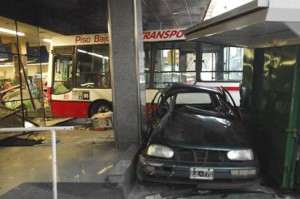 El micro terminó incrustado en un supermercado y el automóvil cortó algunas líneas de energía eléctrica y quedó sobre la vereda.