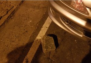 Mi sorpresa fue encontrar debajo del auto un adoquín de los grandes, mientras detenía la marcha y revizaba debajo del auto, pasó una moto conducida por dos adolescentes que dobleran en una diagonal, para volver junto a otras motos, una de estas conducida por dos mayores que observaban el auto y hacían señas al resto, desistieron de serguir acercándose cuando observaron las luces de un móvil policial, conclusión, se daño el chapón del auto, según un efectivo policial que luego encontramos en una estación de servicios a metros del lugar me indicó que a simple vista se había soltado un fuelle del extremo derecho y que llevará el auto al mecánico para revizar ya que la dimensión del adoquín y la mecánica del accidente podrían haber causado algún daño en las mangueras que pasan por debajo.