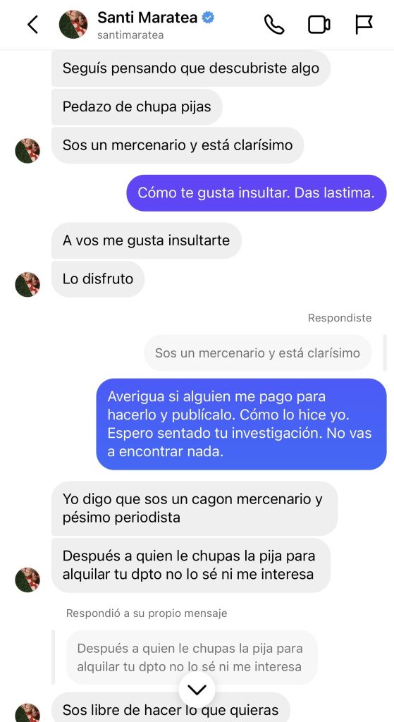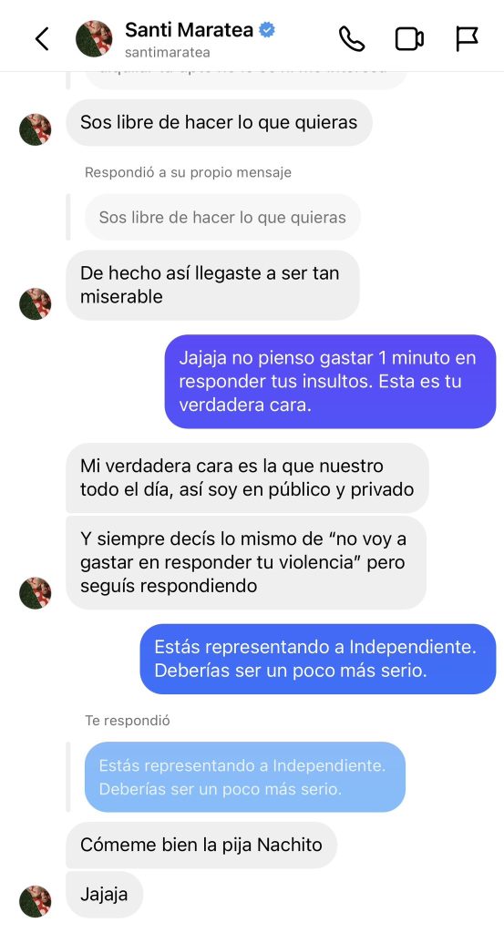 «Este es el verdadero @santumaratea1. Un tipo violento, agresivo y miserable. Una lástima que @Independiente esté representado por un personaje así», fueron las palabras que Genovart eligió para adjuntar las imágenes en las que se ven los chats con Maratea. En los mismos, se puede observar cómo el influencer le dice «mercenario, cagón y pésimo periodista«, así como también le lanzó: «Comeme bien la pija (sic)».