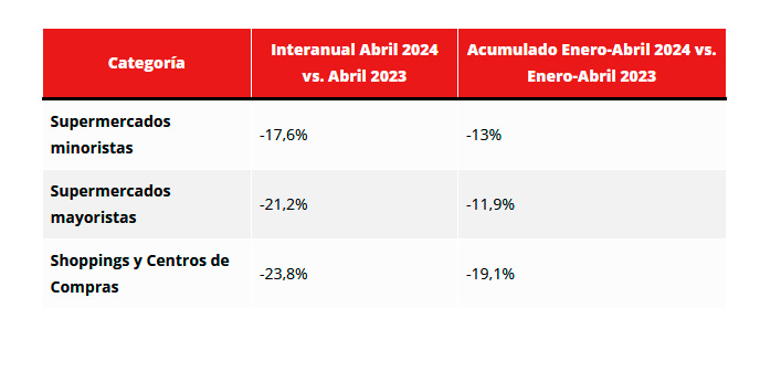 Los shoppings y centros de compras no fueron la excepción en esta tendencia decreciente. En abril de 2024, las ventas en estos establecimientos se redujeron un 23,8% interanual. En cuanto al acumulado del primer cuatrimestre del año, la caída fue del 19,1% en comparación con el mismo período de 2023. Estos valores representan el peor nivel desde la pandemia de Covid-19, cuando había fuertes restricciones debido a las medidas de contención del virus.