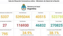 Otras 41 personas murieron y 44.396 fueron reportadas con coronavirus en las últimas 24 horas en la Argentina, con lo que suman 117.245 los fallecidos registrados oficialmente a nivel nacional y 5.739.226 los contagiados desde el inicio de la pandemia, informó este lunes el Ministerio de Salud. La cartera sanitaria indicó que son 1.162 los…