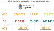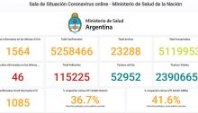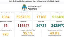 Otras 56 personas murieron y 1.064 fueron reportadas con coronavirus en las últimas 24 horas en la Argentina, con lo que suman 115.547 los fallecidos registrados oficialmente a nivel nacional y 5.267.339 los contagiados desde el inicio de la pandemia, informó hoy el Ministerio de Salud. La cartera sanitaria indicó que son 920 los internados…