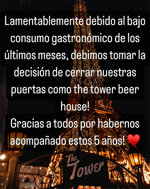 «Lamentablemente debido al bajo consumo gastronómico de los últimos meses, debimos tomar la decisión de cerrar nuestras puertas como The Tower Beer House! Gracias a todos por habernos acompañado estos 5 años!», manifestó la cuenta administrada por los dueños.