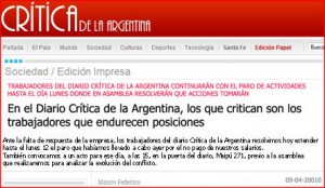 Ante la falta de respuesta de la empresa, los trabajadores del diario Crítica de la Argentina resolvimos hoy extender hasta el lunes 12 el paro que habíamos llevado a cabo ayer por el no pago de nuestros salarios. También convocamos a un acto para ese día, a las 15, en la puerta del diario, Maipú 271, previo a la asamblea que realizaremos para analizar la evolución del conflicto.