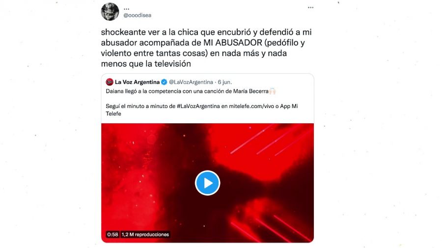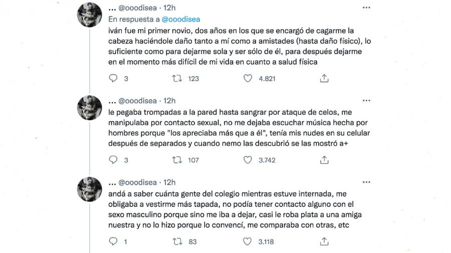 Bajo la cuenta de Twitter @ooodisea, esta persona relató los terribles momentos que experimentó al ver a este hombre, cuyo nombre es Iván: «Shockeante ver a la chica que encubrió y defendió a mi abusador acompañada de MI ABUSADOR (pedófilo y violento entre tantas cosas) en nada más y nada menos que la televisión«. Asimismo, expresó: «Iván fue mi primer novio, dos años en los que se encargó de cagarme la cabeza haciéndole daño tanto a mí como a amistades (hasta daño físico), lo suficiente como para dejarme sola y ser sólo de él, para después dejarme en el momento más difícil de mi vida en cuanto a salud física».