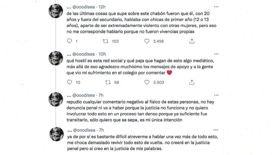 Asimismo, al ver la repercusión de tu tuit, @ooodisea aclaró cuáles eran sus intenciones al hacer pública esta denuncia: «Qué hostil es esta red social y qué paja que hagan de esto algo mediático, más allá de eso agradezco muchísimo los mensajes de apoyo y a la gente que vio mi sufrimiento en el colegio por comentar».