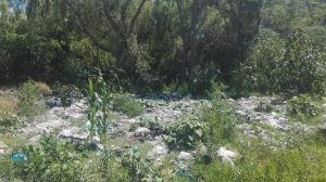 En la recorrida que hicimos ayer en bicicleta vimos una bolsa con muchos huesos, pelos y cuero. Restos de animales, un perro muerto, un auto quemado, basurales, restos de todo tipo de frutas, bolsas de residuos, pañales, preservativos, latas de gaseosa, botellas, y todo tipo de material contaminante.