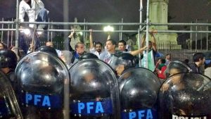 La injustificada represión policial a los docentes que se encontraban por inaugurar la «Escuela Pública Itinerante» en la Plaza de los Dos Congresos, actividad que se desarrollaba con total tranquilidad, promediando la tarde noche, el jefe policial del operativo les comunicó a los docentes que debían retirarse en el acto por una orden que llegó de la presidencia de la Nación.
