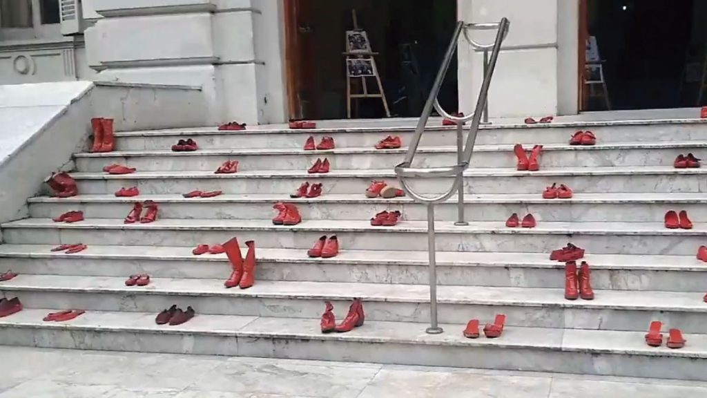 En el marco del Día de la Eliminación de la Violencia contra la Mujer, realizaron una intervención en el edificio de la Suprema Corte de Justicia en La Plata. Colocaron decenas de pares de zapatos rojos para visibilizar la problemática y las pérdidas.